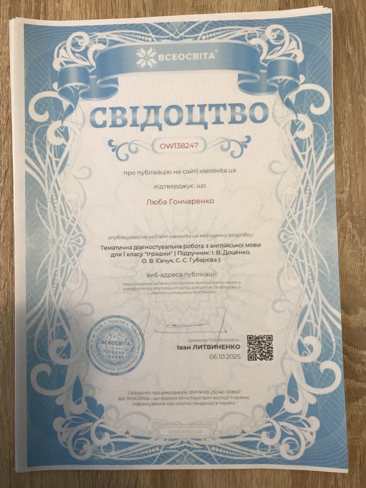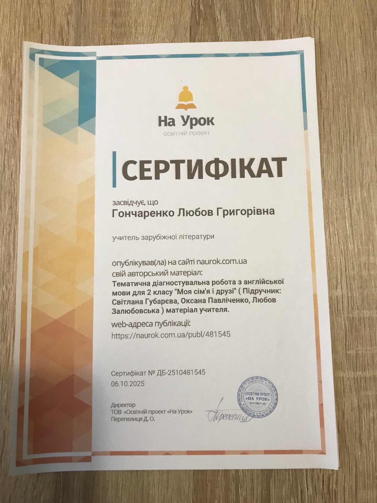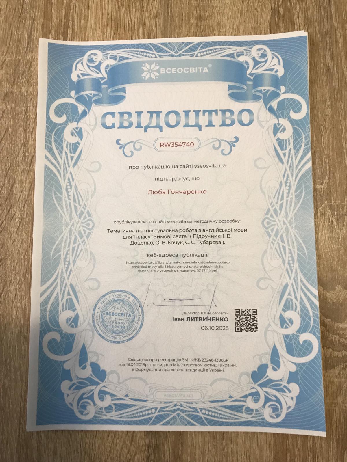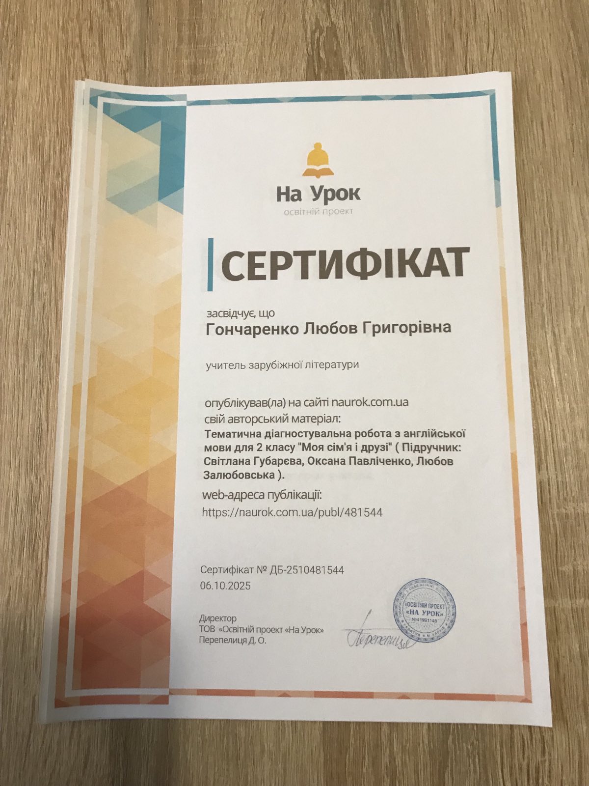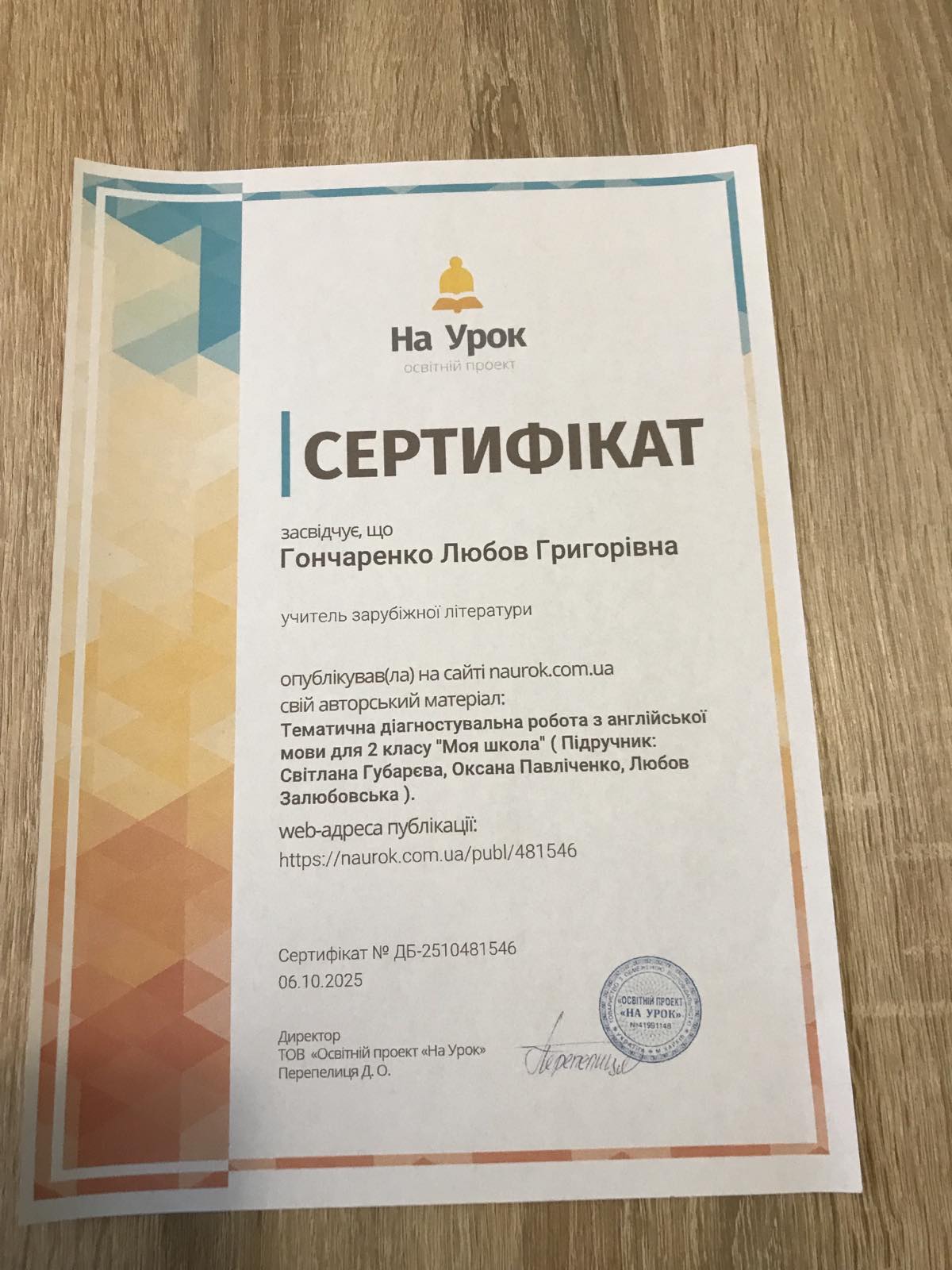 Сертифікати сайту naurok.com.ua за публікацію методичних розробок з англійської мови для початкової школи