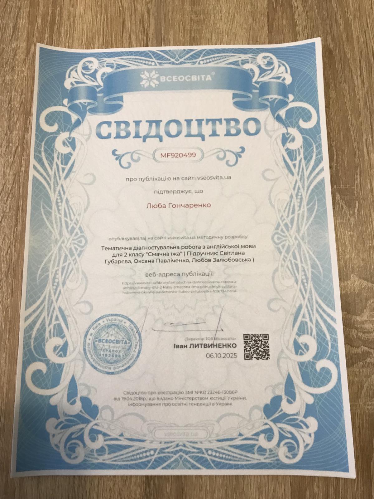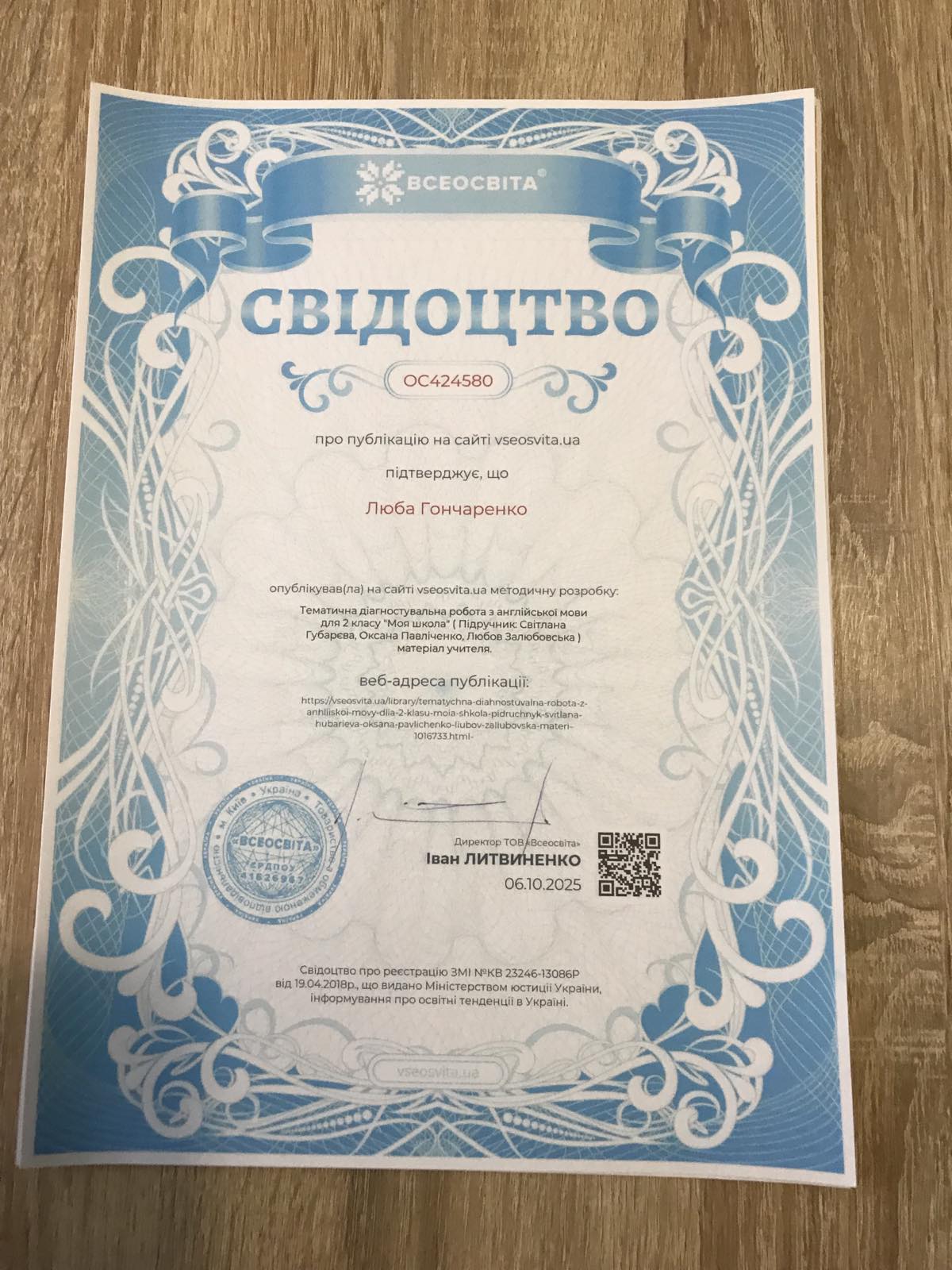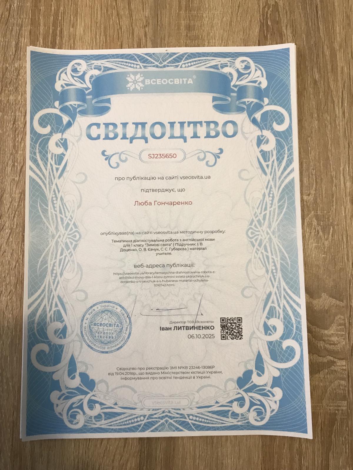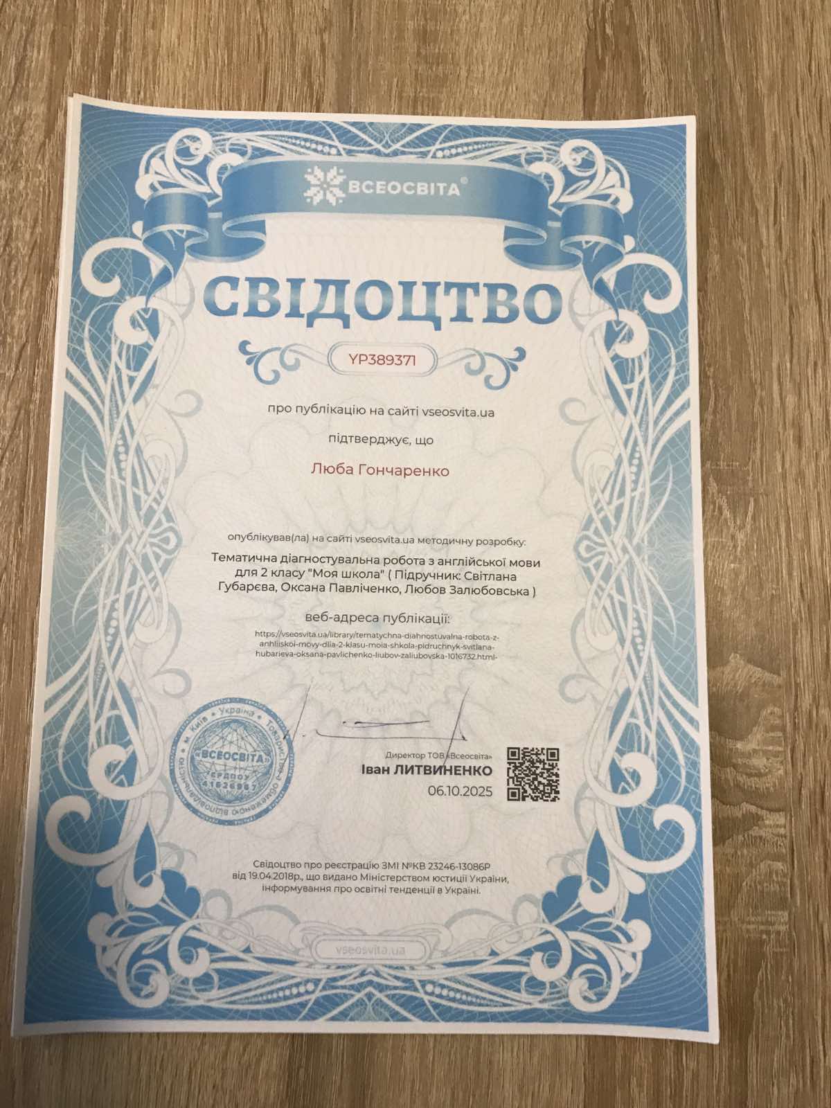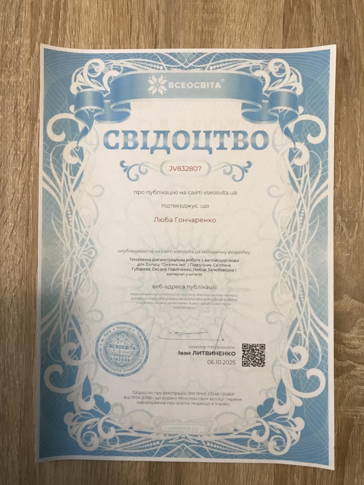 Сертифікати сайту naurok.com.ua за публікацію методичних розробок з англійської мови для початкової школи